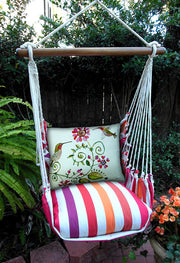 You'll realize what true bliss is when you sink into the comfort of this plush Hammock Chair & Pillow Set.  This Colorful Striped Swing with a hummingbird pillow can be enjoyed indoors and out. Consntructed of 100% polyester, but feels like natural cotton. Use Indoors or Outdoors, weather resistant, fade resistant and mildew resistant.Removable pillow case with zipper. Wood spreader bar attached to 100% polyester rope.  Includes: Humming Bird Pillow, Striped Pillow, Swing, Tote & directions (does not include chain).
