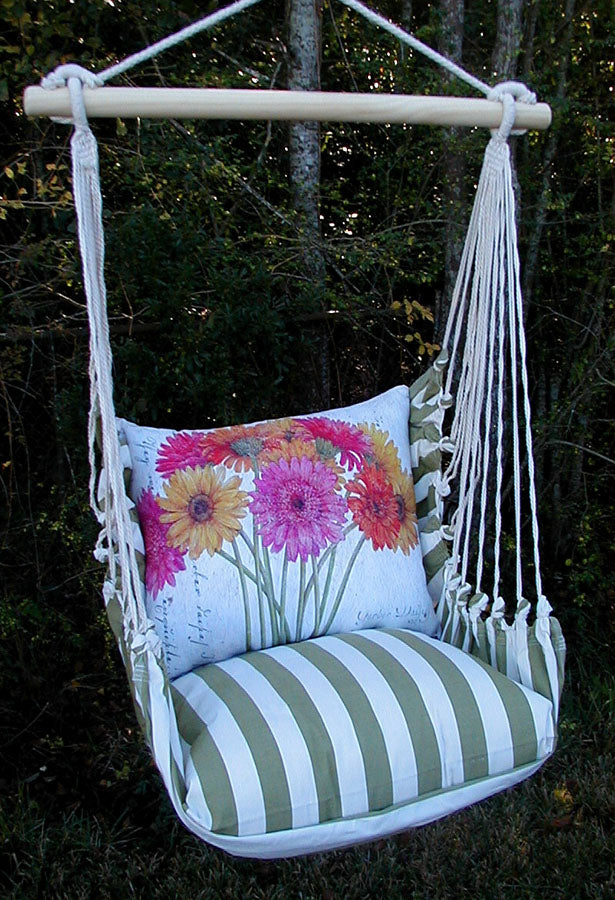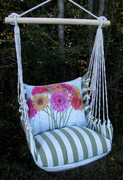 You'll realize what true bliss is when you sink into the comfort of this plush Hammock Chair & Pillow Set. This Colorful Daisy Pillow in the Green & White Swing can be enjoyed indoors and out. Consntructed of 100% polyester, but feels like natural cotton. Use Indoors or Outdoors, weather resistant, fade resistant and mildew resistant.Removable pillow case with zipper. Wood spreader bar attached to 100% polyester rope. Includes: Daisy Pillow, Striped Pillow, Swing, Tote & directions (does not include chain).
