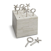 A classic game turned décor. This stylish and functional Tic Tac Toe Game sports a cube white bone body. Polished nickel X’s and O’s give the decorative game a luxurious feel.