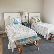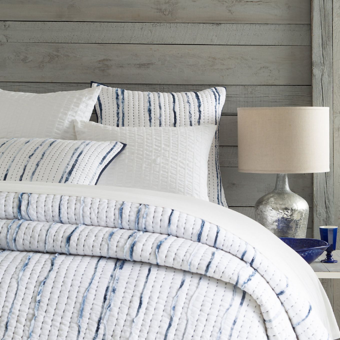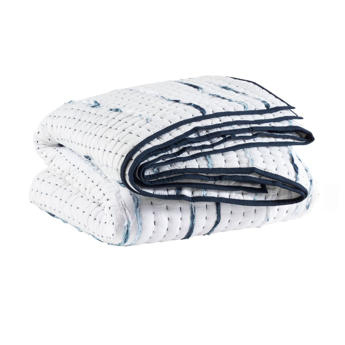 Inspired by traditional Indian kantha quilts, this silky-soft cotton voile quilt features textured, speckled indigo stripes, contrast kantha stitching, and indigo banding on a plush white backdrop. Pine Cone Hill Bedding made by Annie Selke.