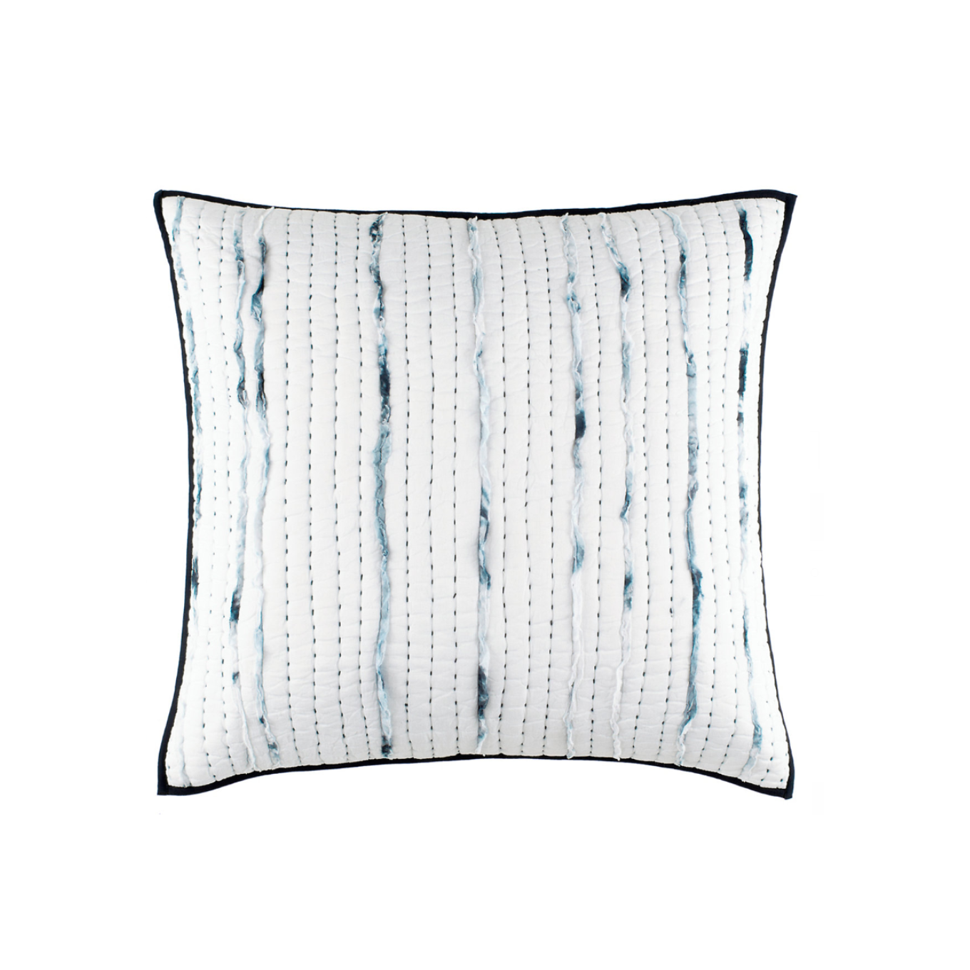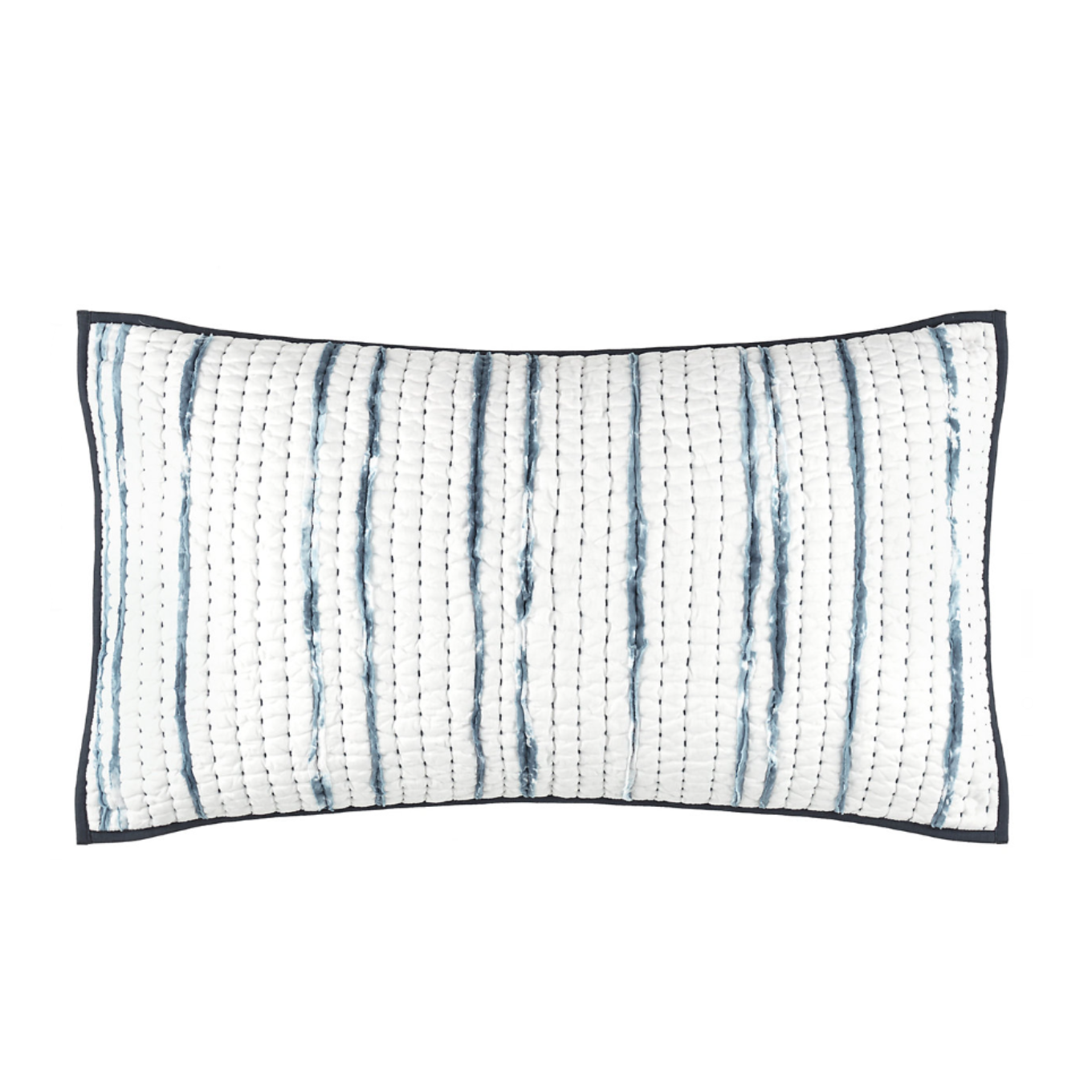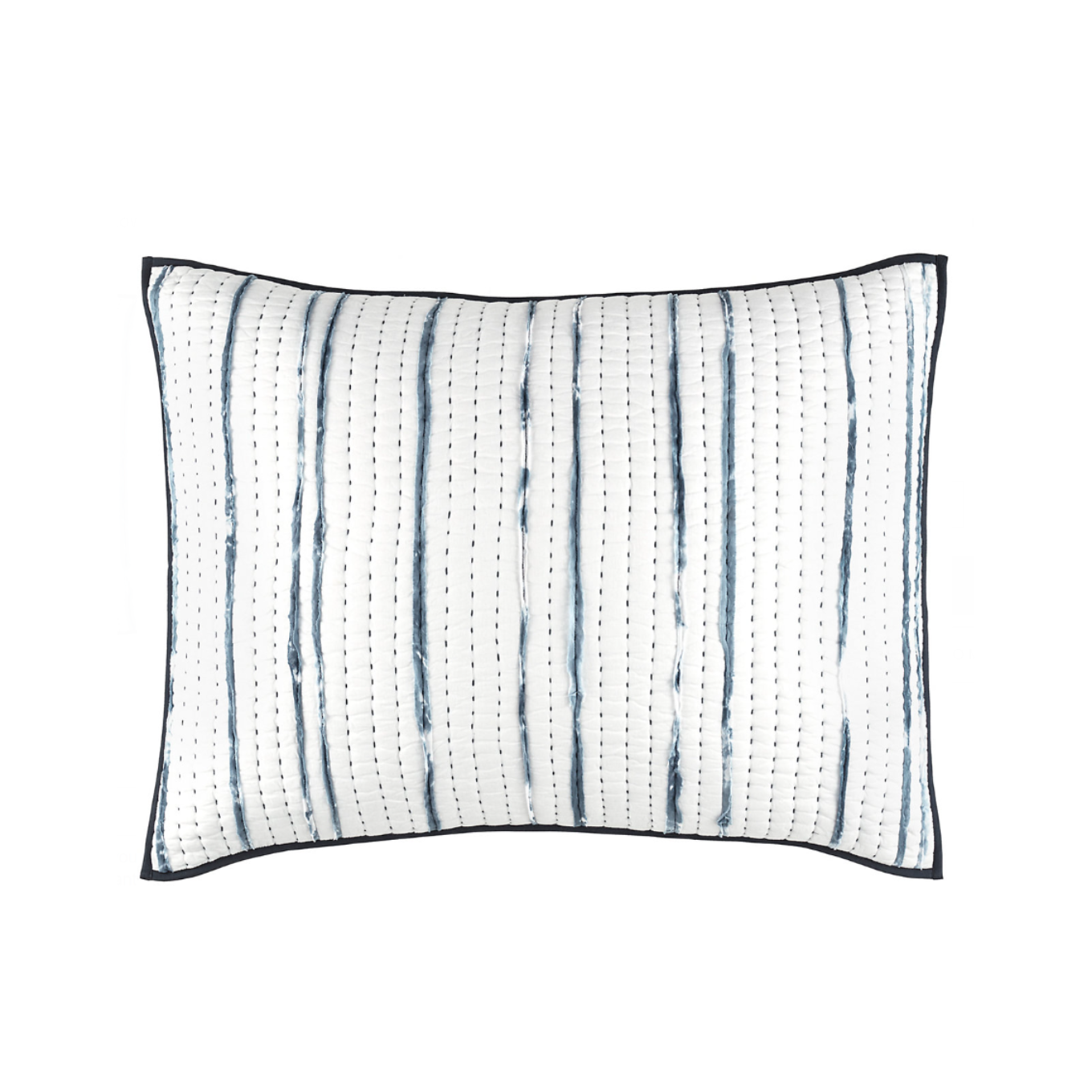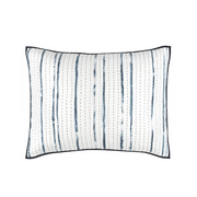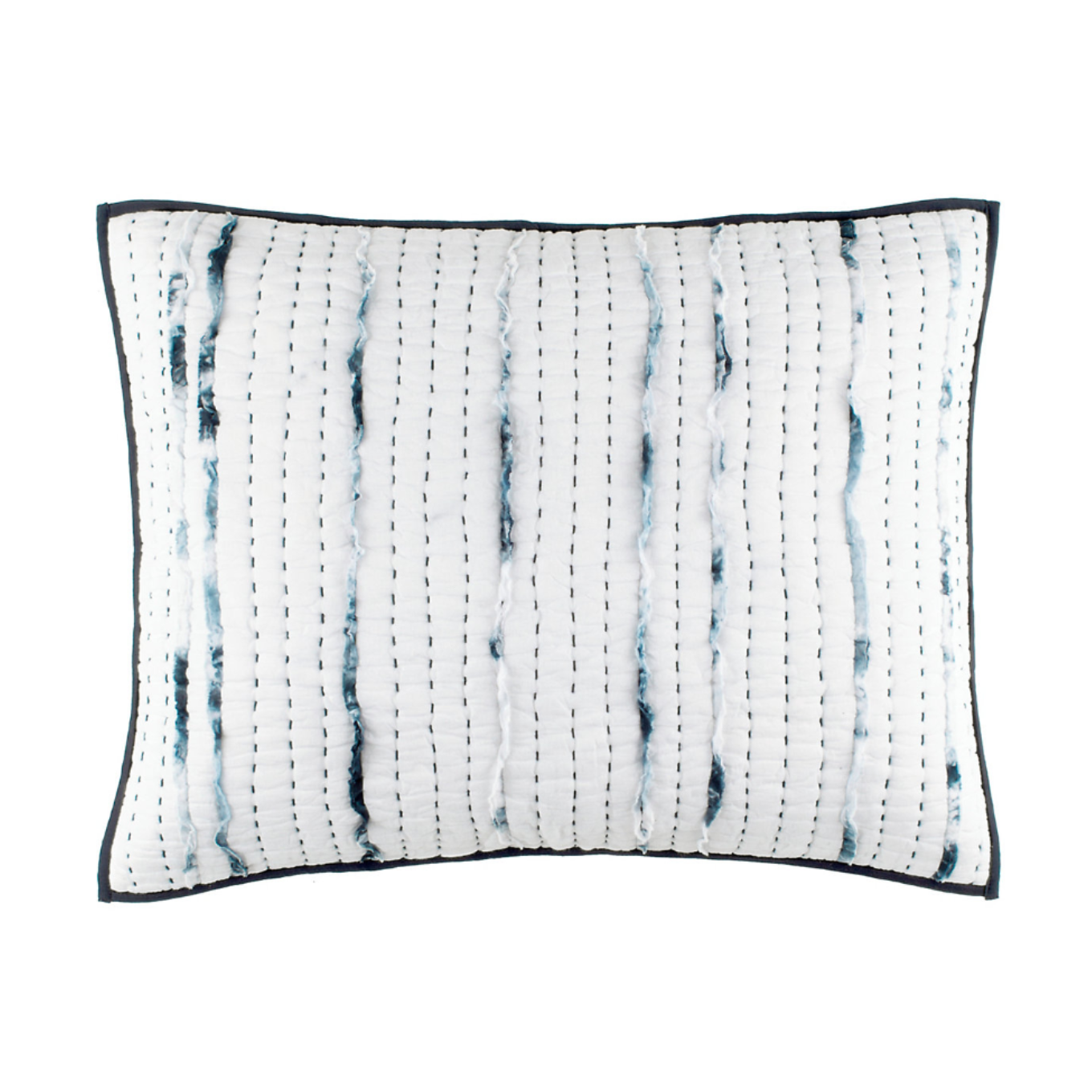 Inspired by traditional Indian kantha quilts, this silky-soft cotton voile Sham features textured, speckled indigo stripes, contrast kantha stitching, and indigo banding on a plush white backdrop. Pine Cone Hill Bedding made by Annie Selke.