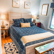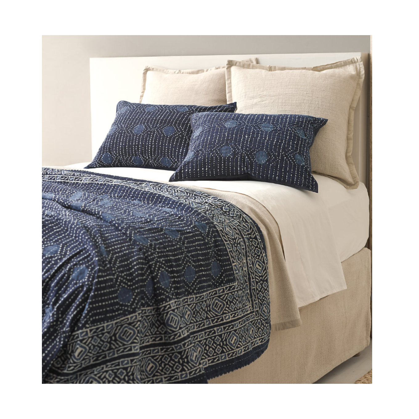 This coverlet's shams has a fun blues with a boho-chic coastal inspired style. Inspired by traditional Indian kantha quilts, this cotton coverlet features a block-style print on an ink-colored background. . Pine Cone Hill Bedding made by Annie Selke.