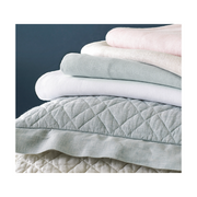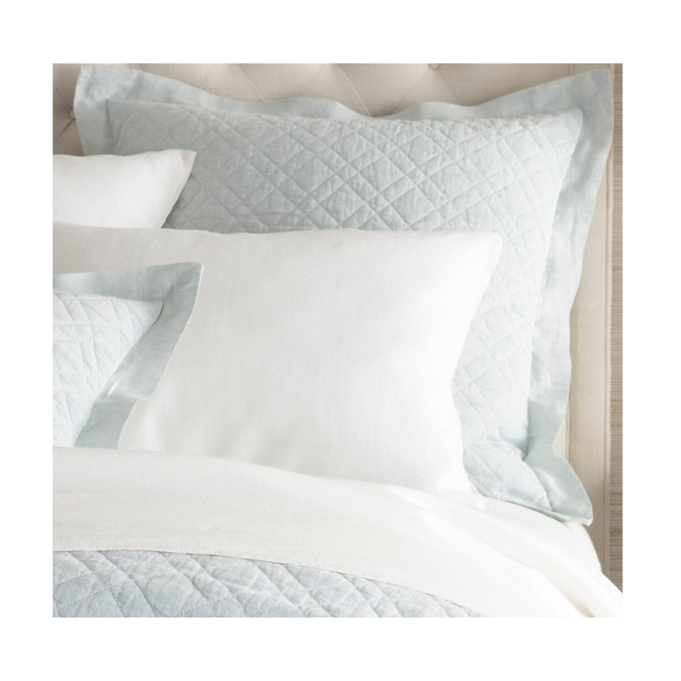 This soft blue quilted shams with traditional diamond quilting stitch keeps it all together. Laundered linen quilt is washed and tumbled to soft perfection for a relaxed, lived in look. Pine Cone Hill Bedding made by Annie Selke.