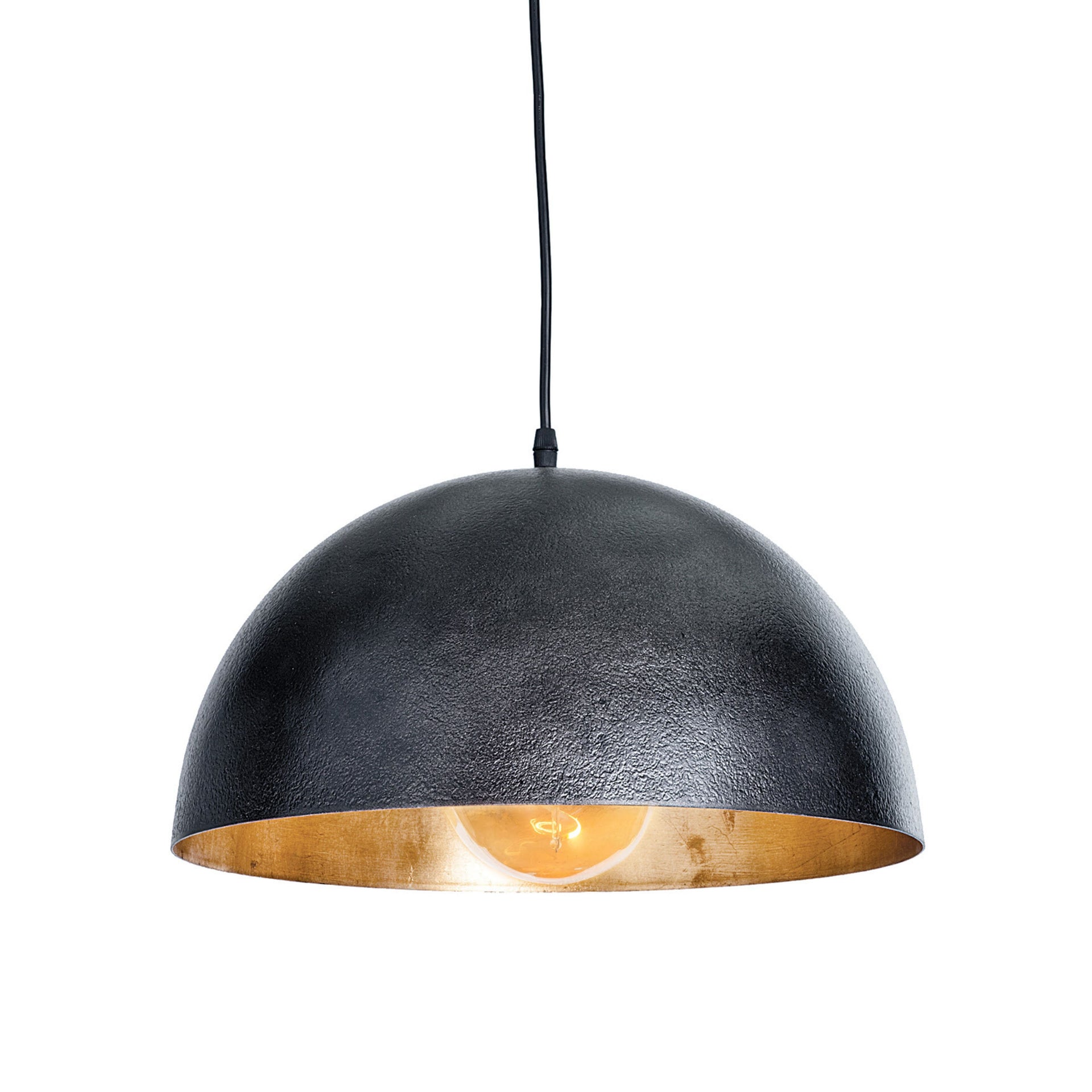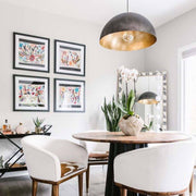 A simple dome shade brings sleek minimalism to the mix. Featuring a gold-leafed finish on the shade’s interior, this gives the room a warm glow and a sophisticated pop of contrast. This Pendent also comes in a large and small size to accommodate different living spaces.