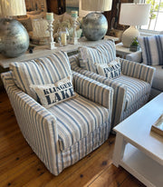 Bring laid-back lakeside or breezy coastal charm into your home with our Slipcovered Swivel Glider Accent Chair. Handcrafted in the USA, this chair combines casual elegance with everyday comfort — perfect for beach houses, lake homes, cottages, or transitional interiors.