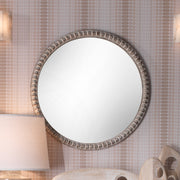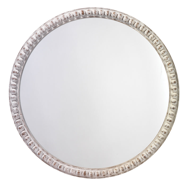 Our Audrey Mirror is classily simple with its delicate, round frame in a white washed wood finish. The slender frame has the additional detail of wood spheres around its perimeter. This light and airy mirror is the perfect addition to any guest room or bathroom.