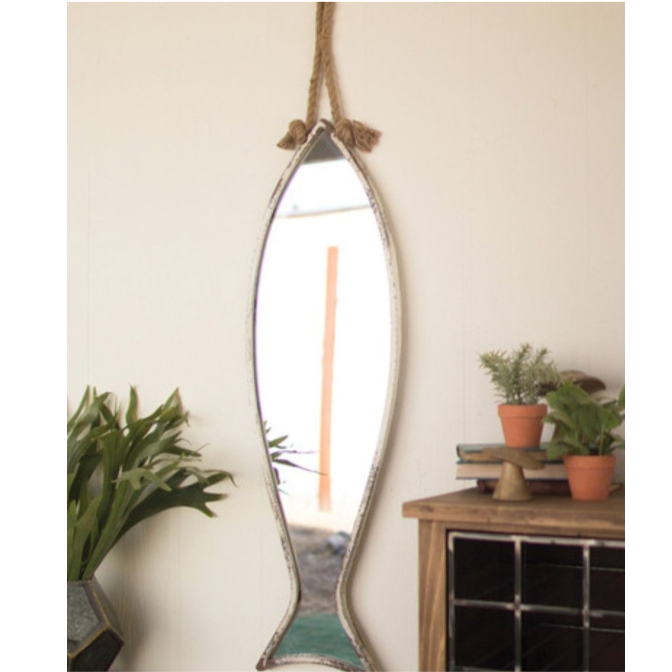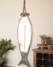 Bring coastal charm to your walls with our Hanging Fish Mirror. Featuring vintage glass, a distressed white finish, and a natural rope hanger, this vertical accent adds seaside character to any space. Perfect for entryways, bathrooms, or lake house walls.