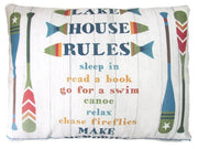 This Lake House Rules accent pillow can be enjoyed indoors and out. Constructed of 100% polyester, but feels like natural cotton. Use Indoors or Outdoors, weather resistant, fade resistant and mildew resistant. Removable pillow case with zipper.