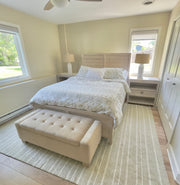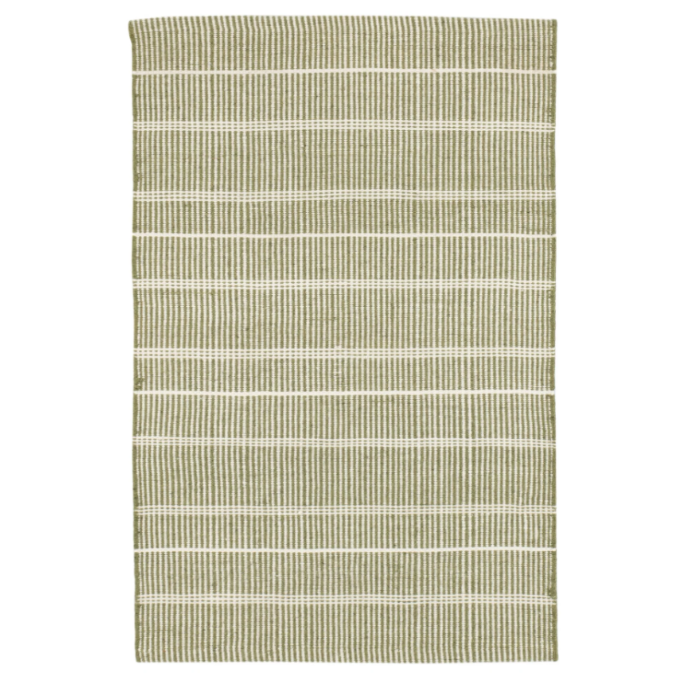 In a calming sage green, the Samson Handwoven Indoor/Outdoor Custom Rug brings subtle coastal-bohemian charm to porches, patios, and well-loved rooms. Designed with Bunny Williams and inspired by an antique textile from her archives, it’s crafted from recycled polyester that’s fade-resistant, lightweight, reversible, and easy to care for. Dash & Albert by Annie Selke.
