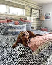Coastal blues with fun modern geometric pattern, this quilt is the perfect addition to any coastal inspired bedrooms. Pine Cone Hill Bedding made by Annie Selke.